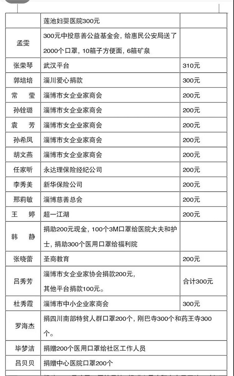 张店女企商会会员姐妹在其他平台,及单位捐助汇总,排名不分先后,统计紧急若有遗漏,爱心同在。现金合计161660元,物资合计14万左右,国难当前,商会的姐妹们用爱心和行动助力这场战役。